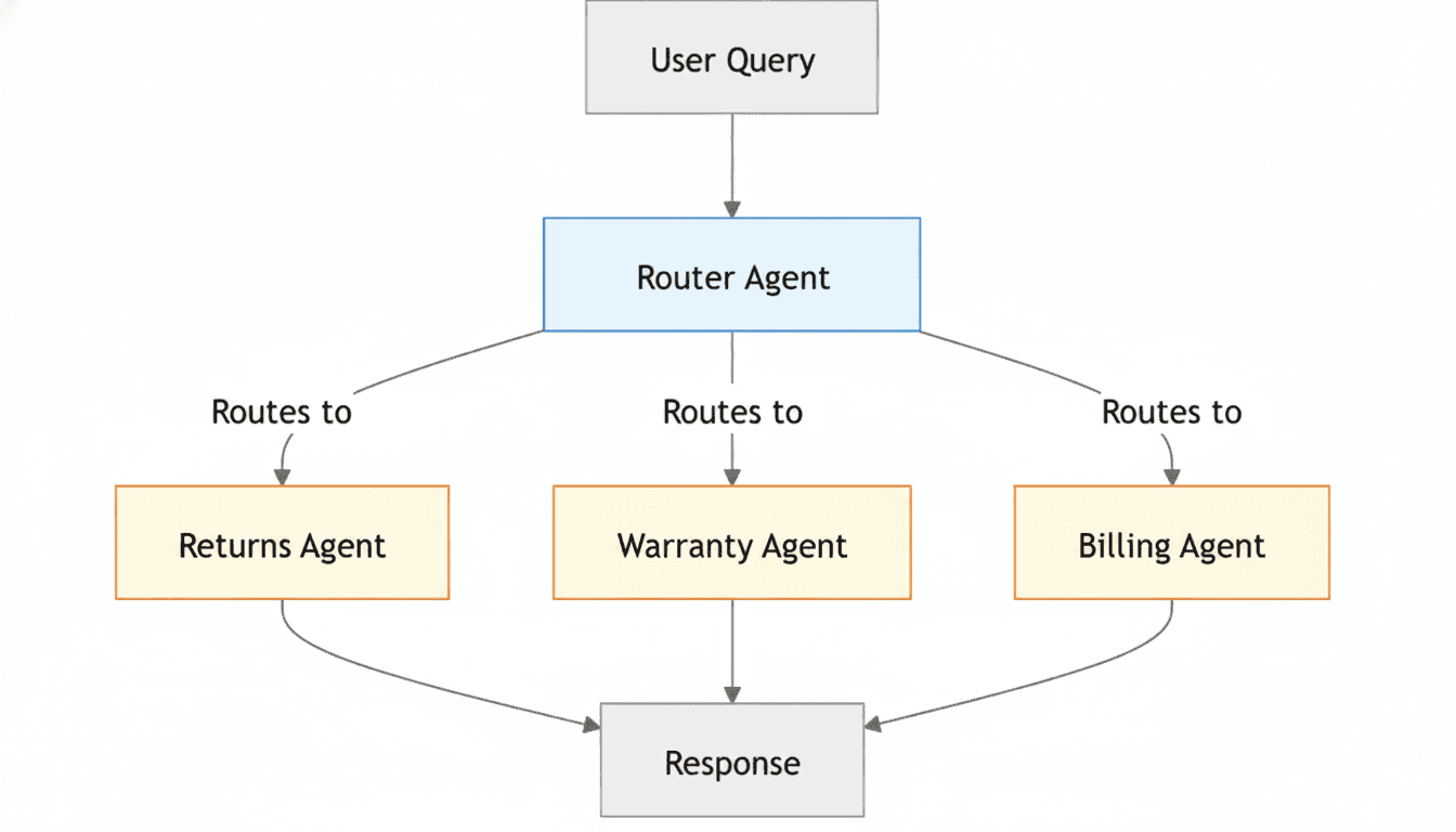 Imagine an customer support agent that handles everything from returns and warranties to billing inquiries. If a single agent tried to juggle all of that, its context would quickly become bloated with conflicting instructions — details about refund policies, warranty timelines, and invoice generation competing for attention. The model’s focus would blur, and even simple queries might produce inconsistent or incorrect responses.